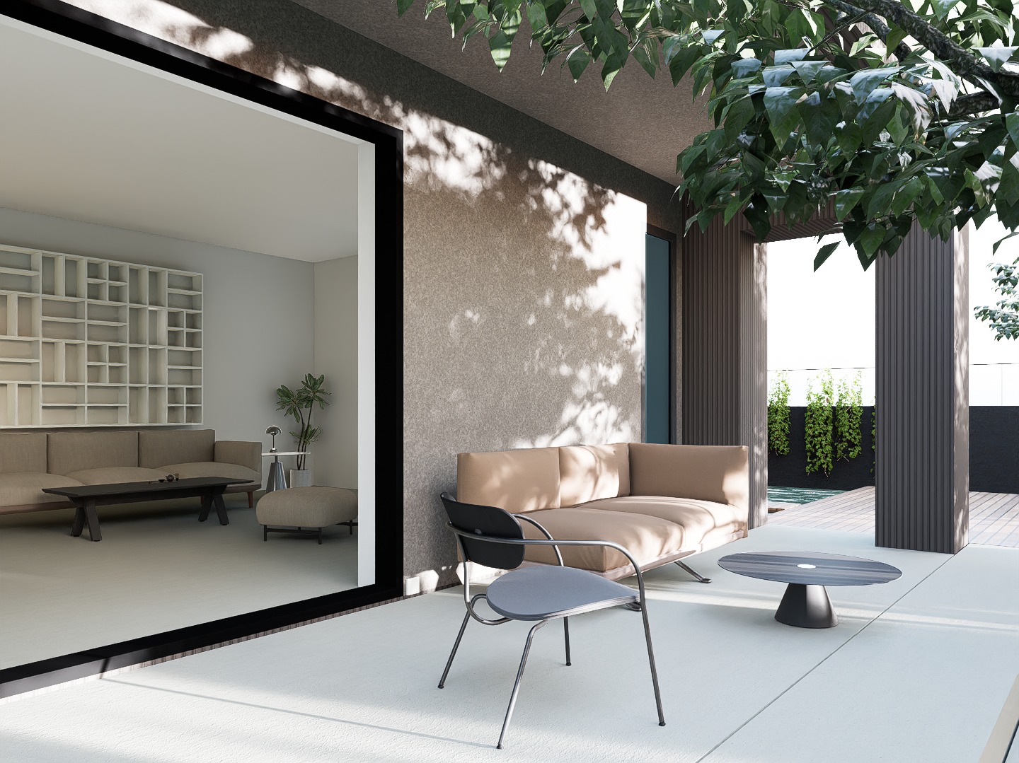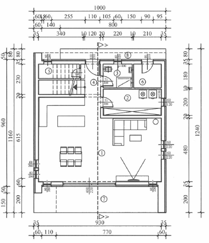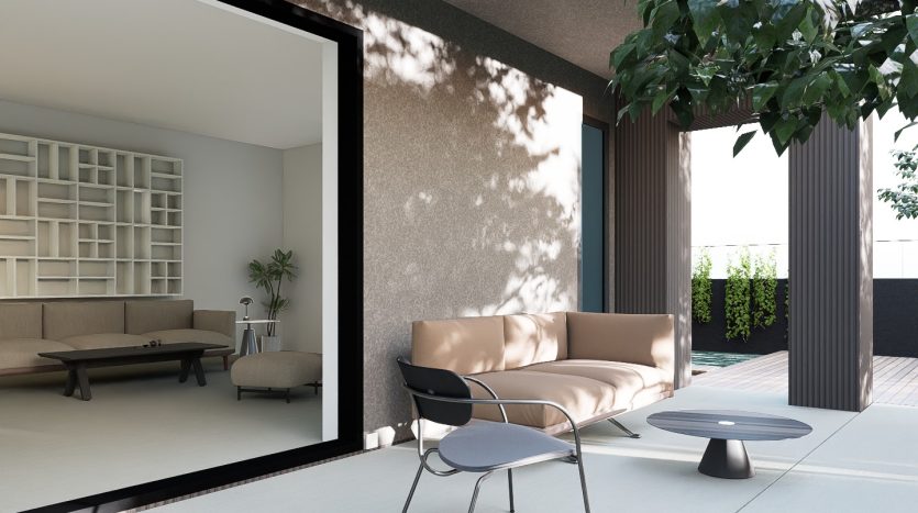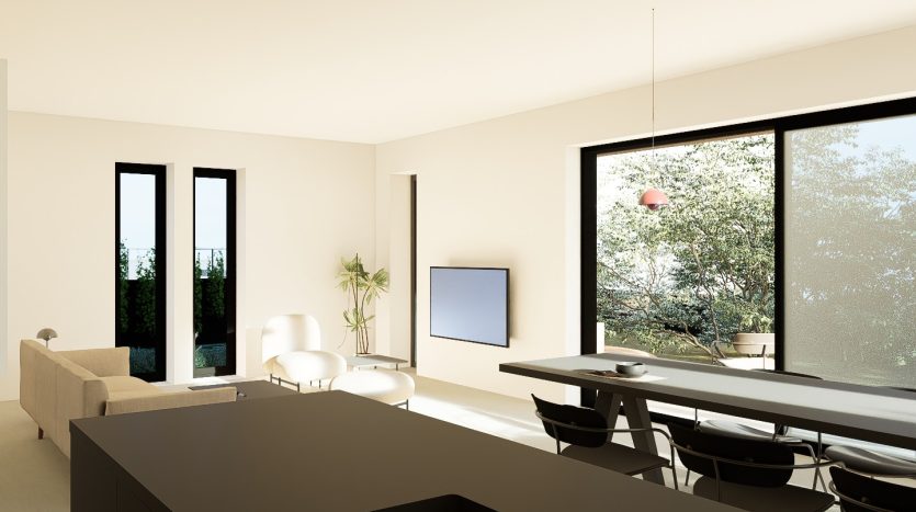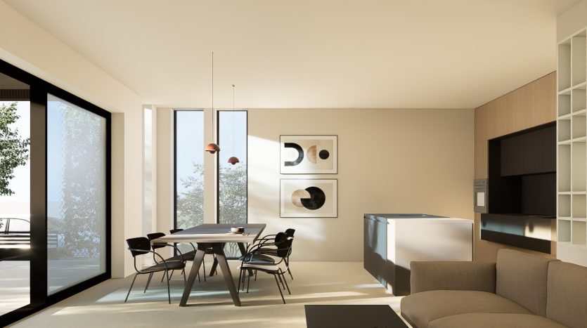 - Pritličje: Obsežna dnevna soba z odprtim konceptom vključuje moderno kuhinjo in jedilnico, kar omogoča druženje in zabavo. Iz dnevne sobe je izhod na prostorno teraso in bazen, ter vrt ki je obdan z oljkami. V pritličju se nahaja še hodnik, tehnični prostor / shramba, kopalnica, praktična delovna soba ali dodatna kuhinjska shramba ter kurilnica z zunanjim vhodom.